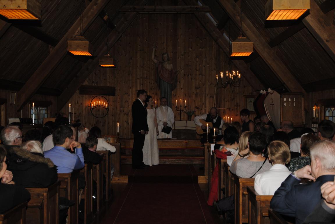 När allt lugnat ner sig lite och klockan var 15:55 var det dags att hoppa på skotern och åka upp till kapellet som låg ca 500 meter från stugbyn. Regnet spela inte längre någon roll utan nu var det fullt fokus på dagens huvuduppgift. Prästen mötte upp utanför och när dörrarna slogs upp var det lite nervöst för att inte tala om färden fram till altaret. Kapellet var fyllt till bristningsgränsen vilket förklarar tidigare nämnda brand incident. Väl framme vid altaret infann sig dock ett inre lugn och jag har aldrig känt mig mer säker på nått än när prästen till slut frågade det där han brukar fråga. Det var som att man var i en egen liten värld och när man sen vände sig om igen och såg alla som var där bara för vår skull så blev man alldeles varm i hjärtat. Sen var det dags för vår vän Anna att sjunga en låt som hon själv skrivit både text och musik till. Hennes kille Per kompade med gitarr och inte ett öga var tort. Måste lägga ut det på tuben för det var riktigt bra. En Kul grej om Anna och Per är att dom båda är svenska mästare förra året, hon i handboll och han i bänkpress.