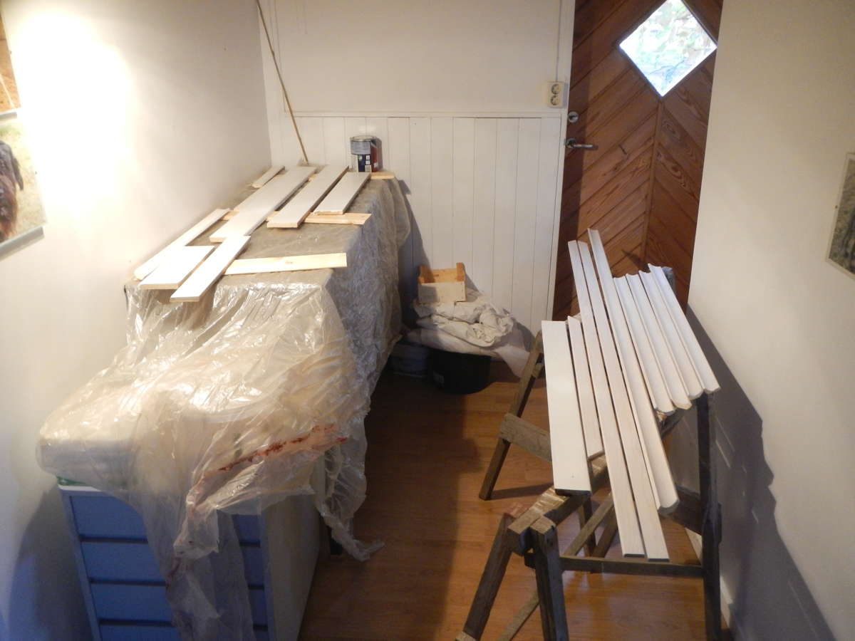 Tillkapade och testade på plats var det dags för grundmålning, tillsammans med golvlisterna och foder till garderobsdörren. Eftersom garaget är ockuperat av klarlackade hylldelar på tork så fixade jag målarverkstad i den nedre hallen.