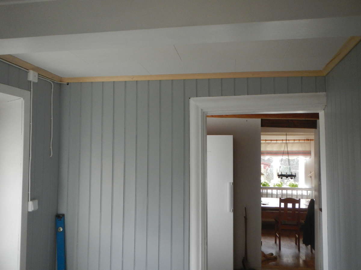 I natt drömde jag om taklister. Tog det som en varning att inte skjuta upp tillkapningen av dessa något mer. Jag har köpt hålkäl, som jag tycker är en snygg variant. Ett problem med den är att när man skall såga geringshörn så är det mycket lätt att bli alldeles vimsig över på vilket håll den skall sågas. Snål som jag är så har jag inte köpt så det finns nåt extra att ta av om det blir fel. Man köper inte gärna mer än som behövs när det kostar nästan fyrtio kronor metern. Så det ville till att hålla tungan rätt i mun, testa och dubbelkolla. Klarade ut det, men det var nära vid ett par tillfällen.