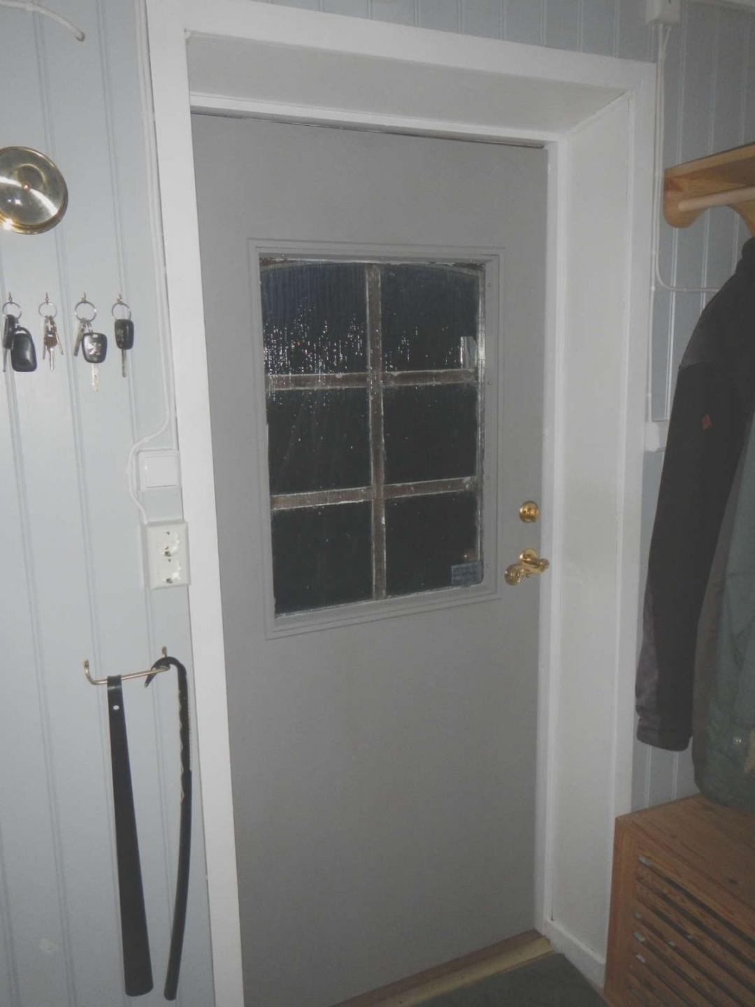 Ytterdörrens insida var brunbetsad och ganska medfaren. Önskemål om en grå dörr fanns, något mörkare än panelen. Den grå färgen till köksluckorna var just det och av den fanns det rätt mycket kvar. Gick åt tre strykningar för att få bra täckning på den mörkbruna grunden.