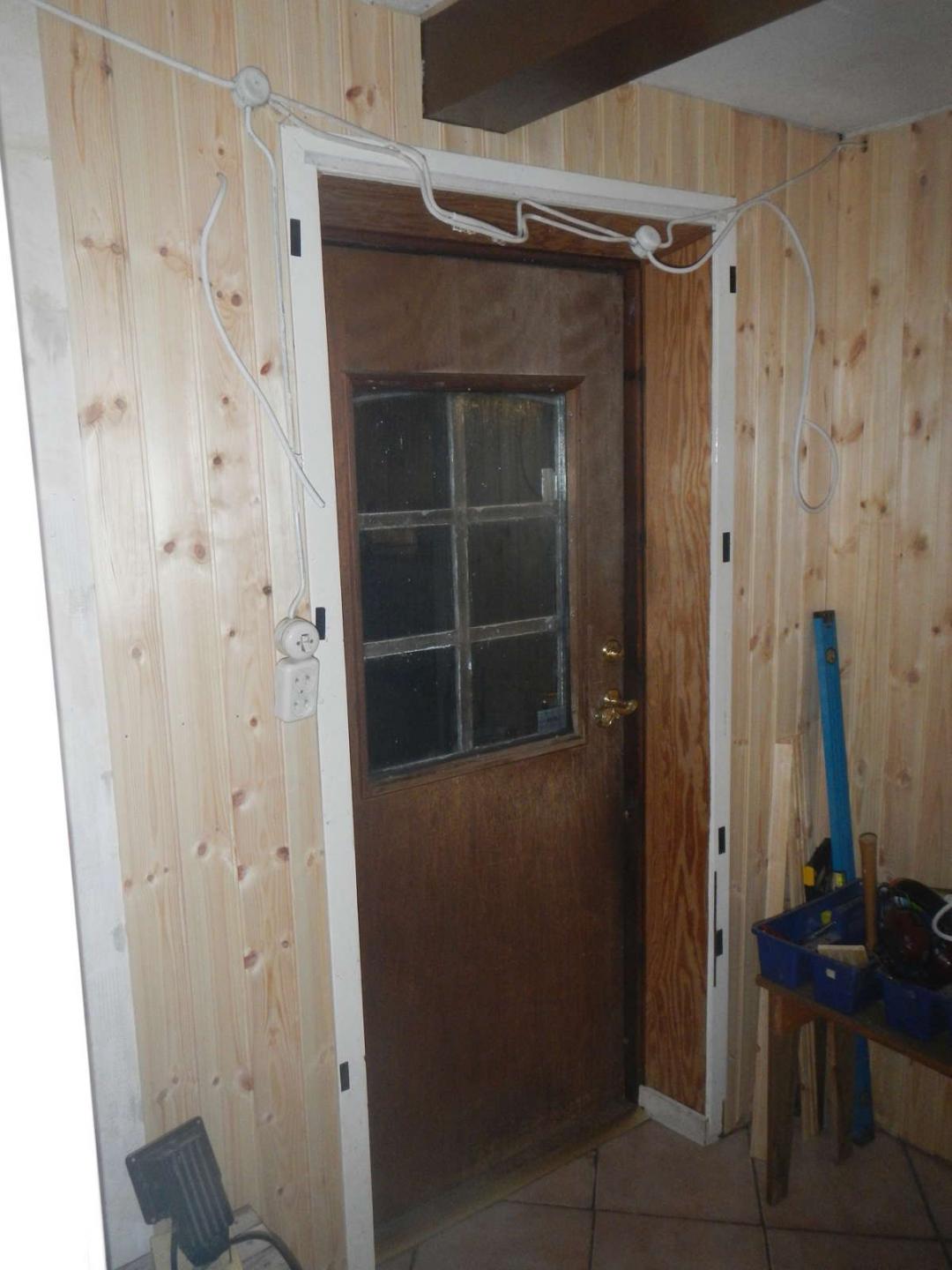 Knåpat på med ytterväggen idag. Här var det två kablar som går ut genom väggen, den till höger om dörren till ytterlampan, till vänster till ett uttag på väggen. Den till ytterlampan kom från en kulodosa, lätt att koppla loss. Ny kabel blev det där, den gamla var ingrodd med smuts och gammalt tapetklister. Den till uttaget kom direkt inifrån centralen. Den blev klippt och där syns nu en dosa där den är inkopplad och där ny kabel kan kopplas in. Dosan hamnar inuti det skåp som skall byggas där.