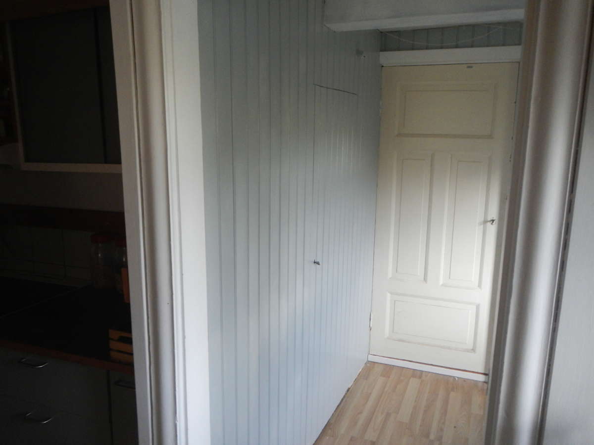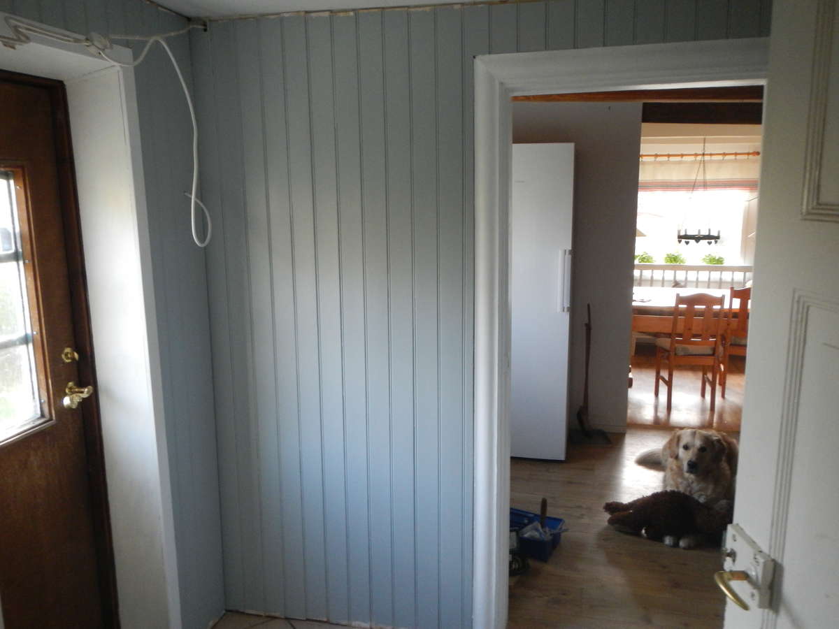 Grundmålning och första strykningen vit färg på dörrfodren och takbjälken är gjord. Minst en strykning till. Så är det tak- och golvlister. Taklister måste jag köpa, där satt bara kvartsstav och det funkar inte mot panelen.