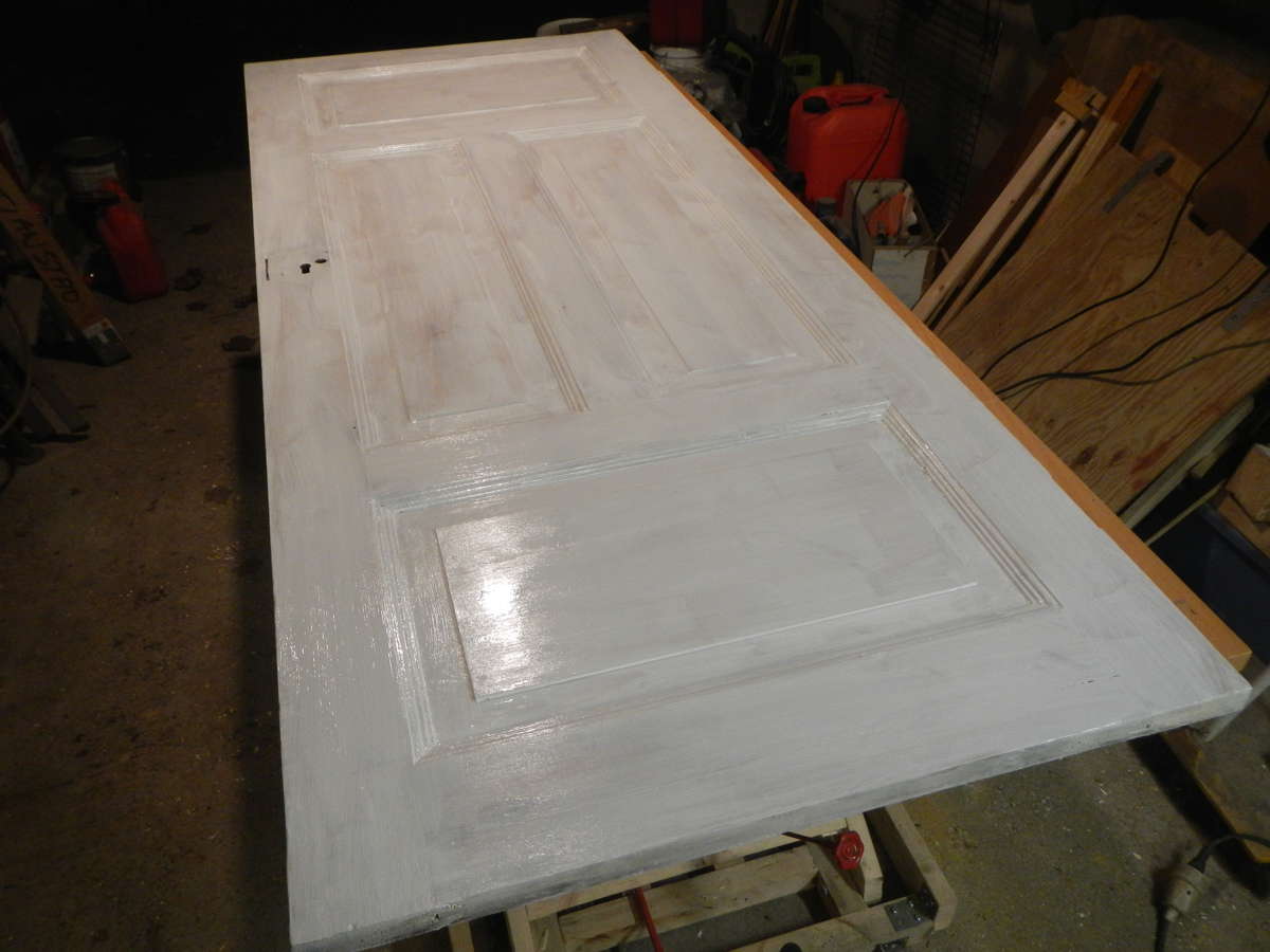 Hållit på med innerdörren. Skrapad och kvistlackad sist jag rapporterade. Sen dess har jag då grundmålat och gjort en strykning med färdigfärg i garaget. Tar sin tid eftersom det bara går att göra en sida i taget. Torktiden för övermålning är 12 timmar, men i rådande temperaturer blir det ett helt dygn mellan strykningarna. Eftersom det sen har blivit gradvis kallare så tog jag in dörren och skruvade upp den igår, onsdag, och målade andra strykningen. Som jag misstänkte så räckte det inte för full täckning på det mörka och av både kvistlack och det skiftande furuträet mörka underlaget. Det blev sålunda en sista strykning idag.