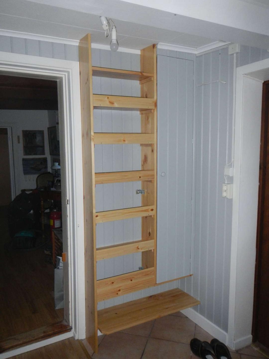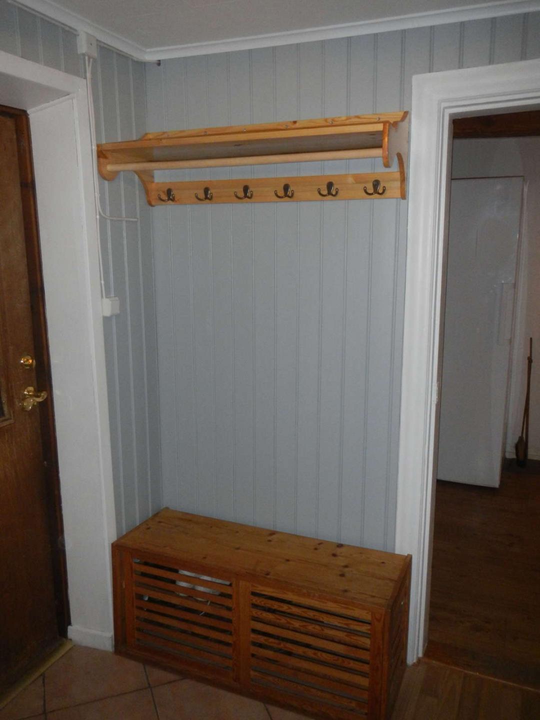 Det gamla skoskåpet som står på golvet inunder skall få sig en uppfräschning sen. Funderar också på om det går enkelt att korta det en liten bit så det inte skjuter ut över dörrfodret.