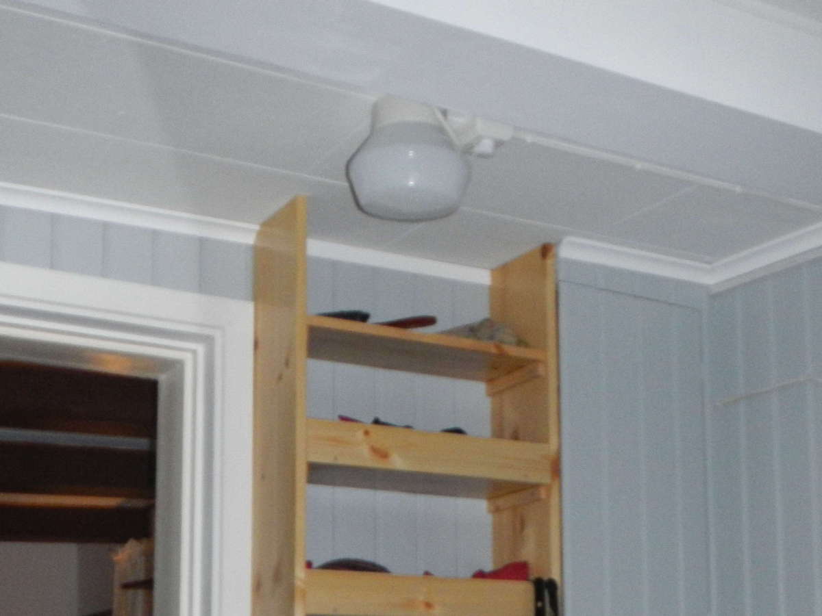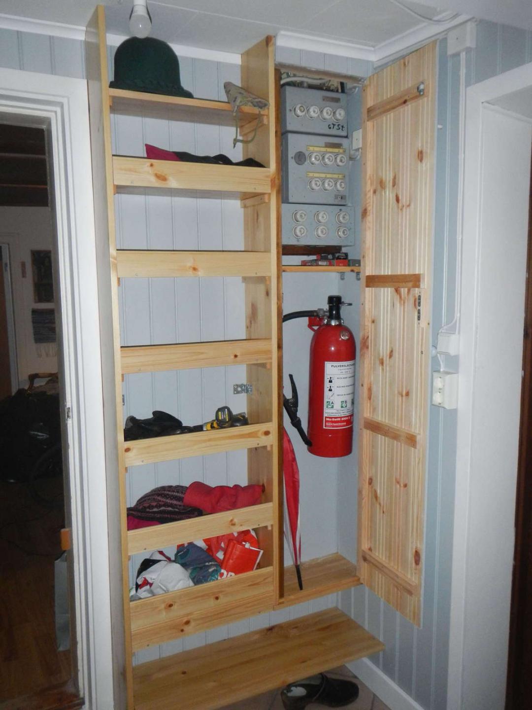Fixade lite med skåpet. Brandsläckaren har hängt där i hörnet innan och nu är den åter på nästan samma plats. Gjorde också en liten hylla strax under elcentralen där säkringarna kan ligga. Ett magnetlås satte jag dit tidigare. Blev inte riktigt nöjd, någonting är en liten aning skevt så dörren glappade mer än en halv centimeter i överkant. Syns på förra bilden att det inte är tätt. Ett extra rullsnäpplås på den översta tvärregeln löste det problemet.