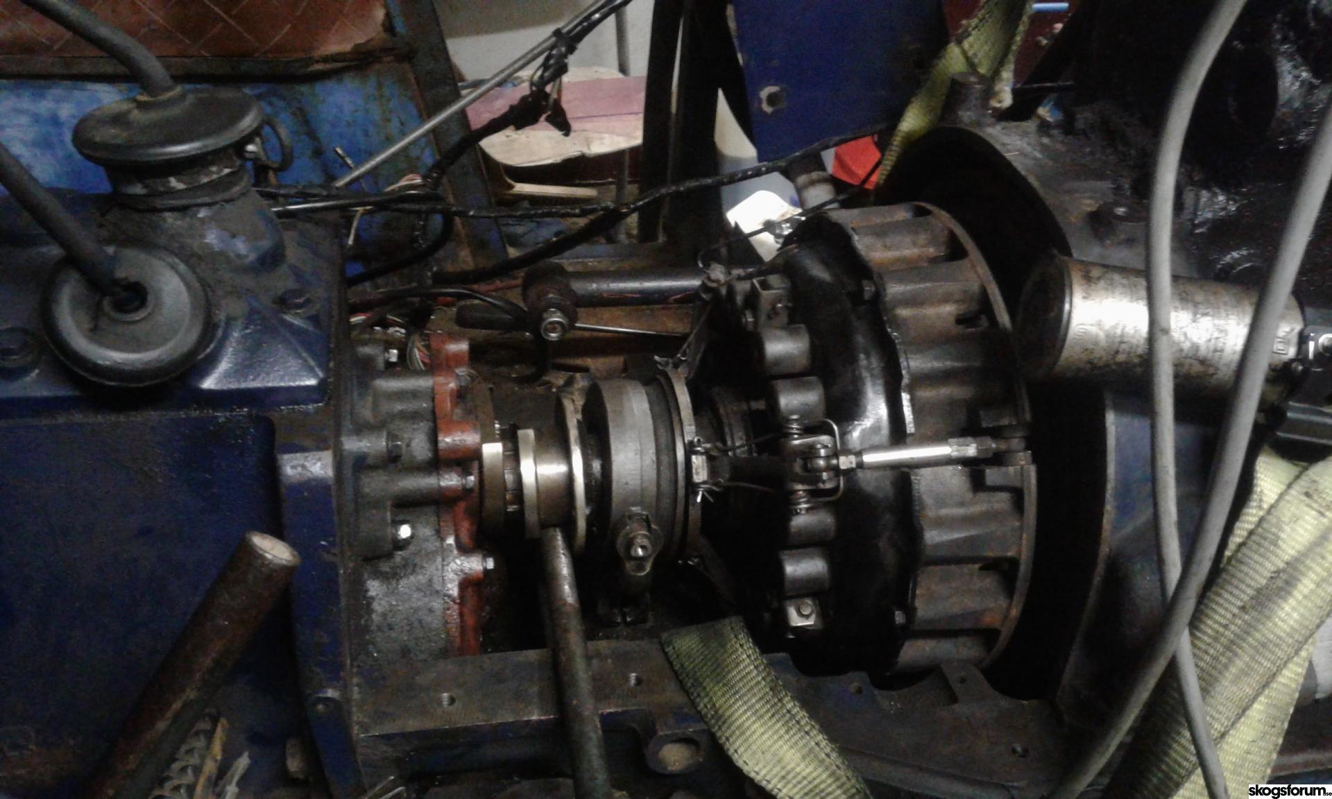 Kopplingen på traktorn gav upp. Kopplingsskivan ligger alldeles intill svänghjulet. Trångt som bara den att demontera. Nu är gamla skivan utbytt emot en ny. Beläggen hade lossnat och kilat fast så traktorn drog hela tiden.