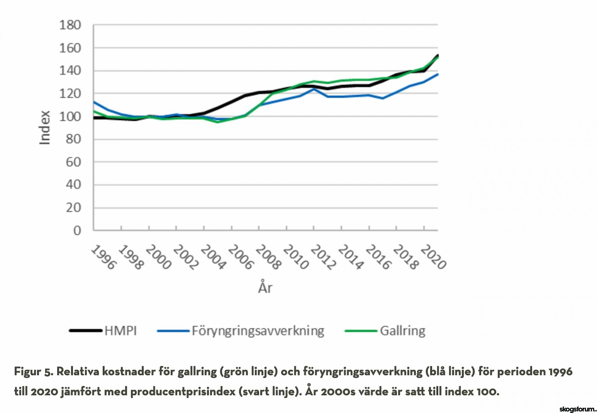 Främsta anledningen till att lönsamheten minskar är att virkespriset inte hänger med kostnadsökningen. När det gäller avverkningarna så har kostnaden för gallringsavverkning följt med kurvan för andra kostnadsindex (se nedan) men för föryngringsavverkning så ligger kostnadsutvecklingen under den allmänna kostnadsökningen. Den kostnad som ökat mest verkar vara vägtransporter. Den kostnadsutvecklingen ligger högt över allmän prisutveckling.