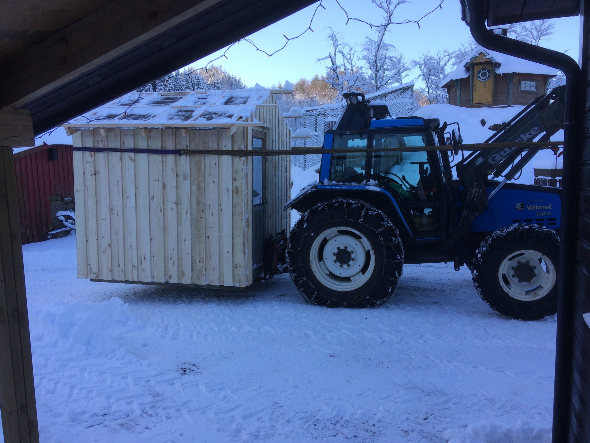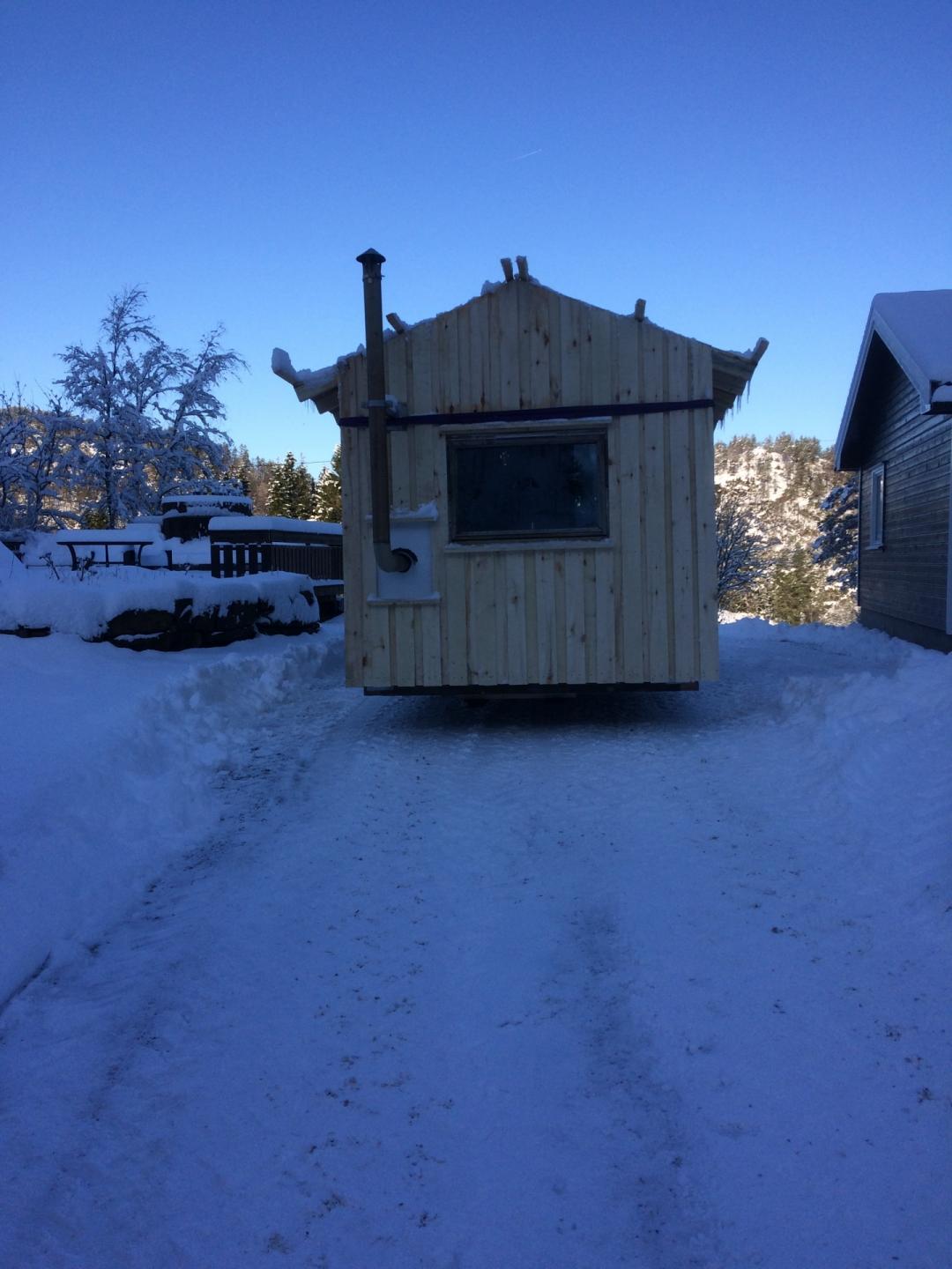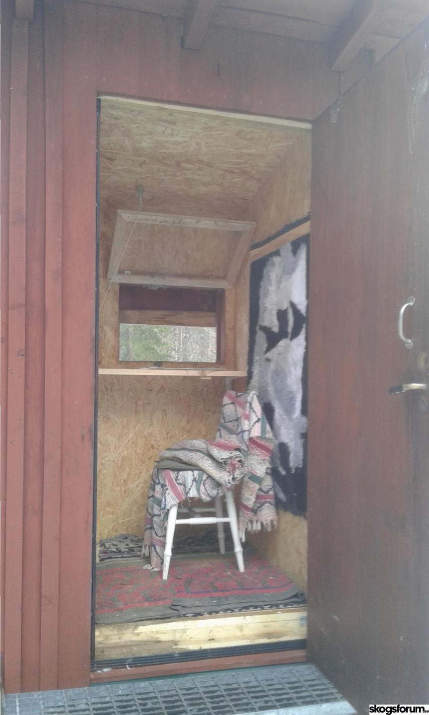 Inne blir det en sittbänk utmed ena långsidan o fällbar bordsskiva på andra väggen. Små öppningsbara fönster ovan bordsskivan.