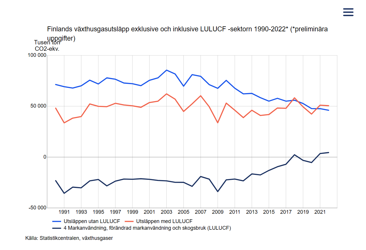 Finlands klimatlag säger att landet ska vara klimatneutralt senast år 2035. Idag ligger utsläppen på ca 47 miljoner ton CO2e och det är alltså dessa som måste täckas upp för på annat håll. En stark tilltro har satts till skogens förmåga att årligen binda koldioxid via fotosyntesen. Tillväxten i de finska skogarna är omkring 100 miljoner kubikmeter per år vilket motsvarar knappt 140 miljoner ton koldioxidekvivalenter. Men en stor del av den årliga tillväxten avverkas och på senare tid har Finland, likt Sverige, sett en minskning i den årliga tillväxten.